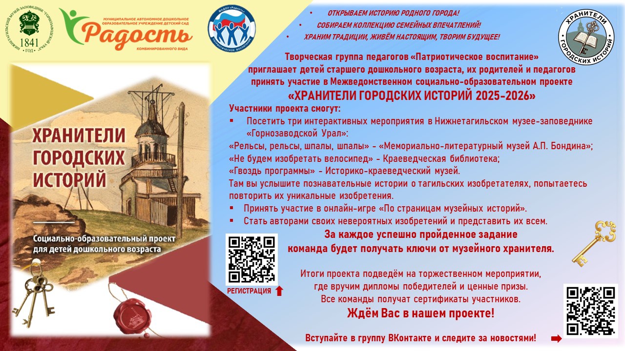 «Хранители городских историй» – межведомственный социально-образовательный проект, который объединяет детей старшего дошкольного возраста, их семьи, педагогов с историческим и культурным наследием нашего родного города, способствует познавательному и духовному обогащению подрастающего поколения.